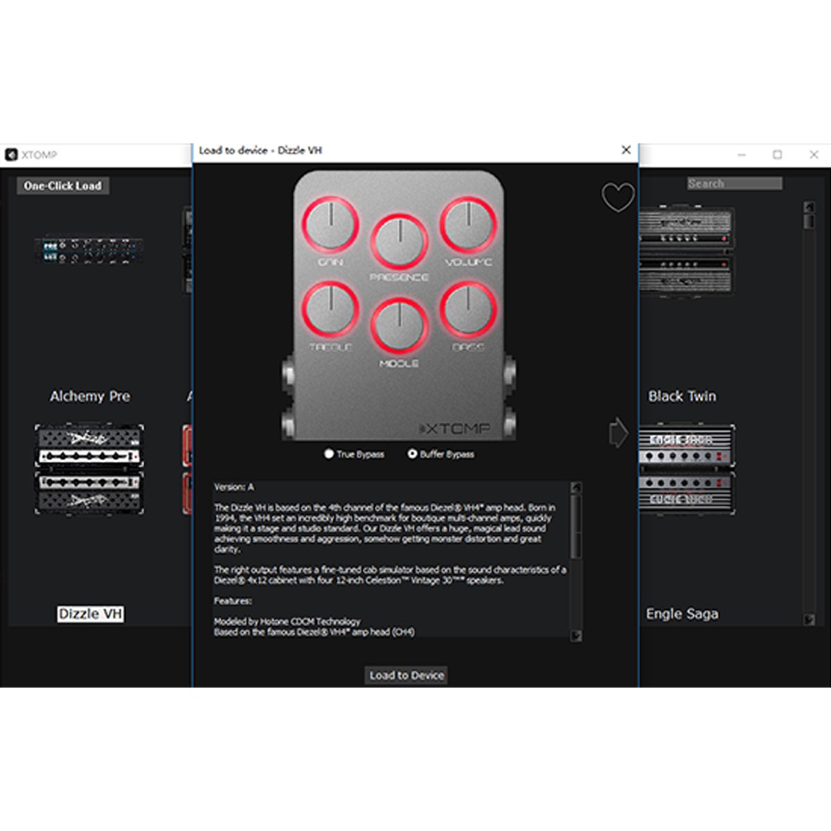 Al igual que XTOMP, simula todo tipo de amplificadores/cabinas/pedales clásicos, clásicos y modernos icónicos y crea algoritmos originales/estándar nuevos a través de su creciente biblioteca de efectos.